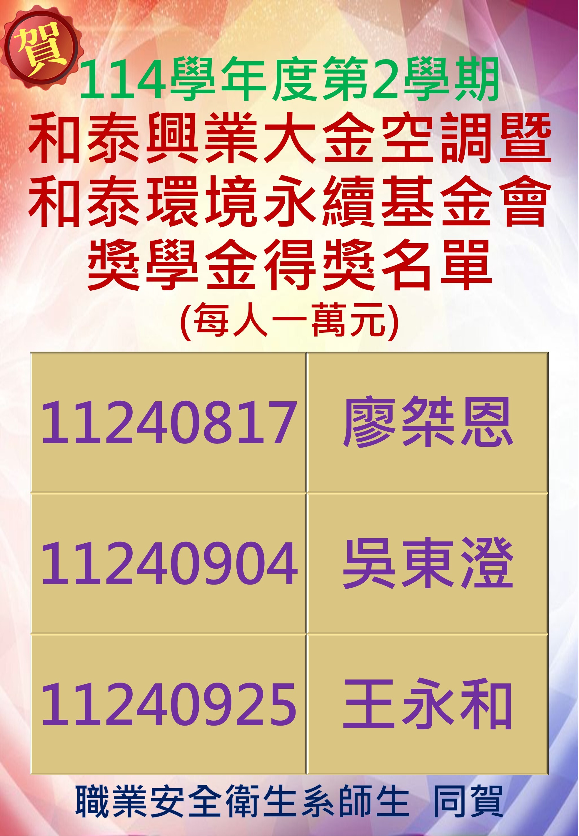 賀!114學年度第2學期財團法人和泰興業大金空調暨和泰環境永續基金會獎學金得獎名單