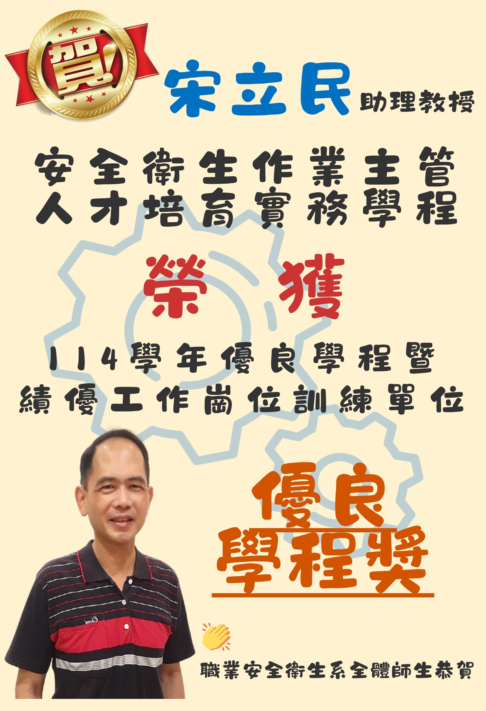 <![CDATA[賀!佘智源同學考取114年四等考試一般警察人員考試行政警察人員]]> 2026-01-29 <![CDATA[賀!宋立民助理教授「安全衛生作業主管人才培育實務學程」榮獲勞動部勞動力發展署「優良學程」獎]]>